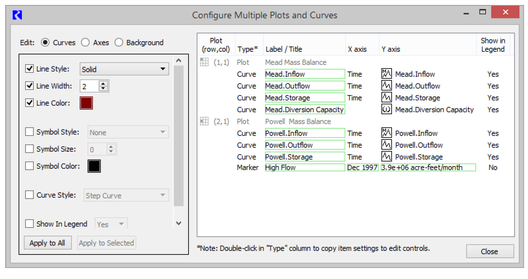 The Configure Multiple Plots and Curves dialog allows you to Edit the appearance of multiple plots or curves in one location. Most plot settings for the optional nine separate plots within a plot page are editable within the dialog. The user can select multiple items within a plot page, e.g. curves and markers, and apply selected settings to those items in a single operation. The dialog is shown in