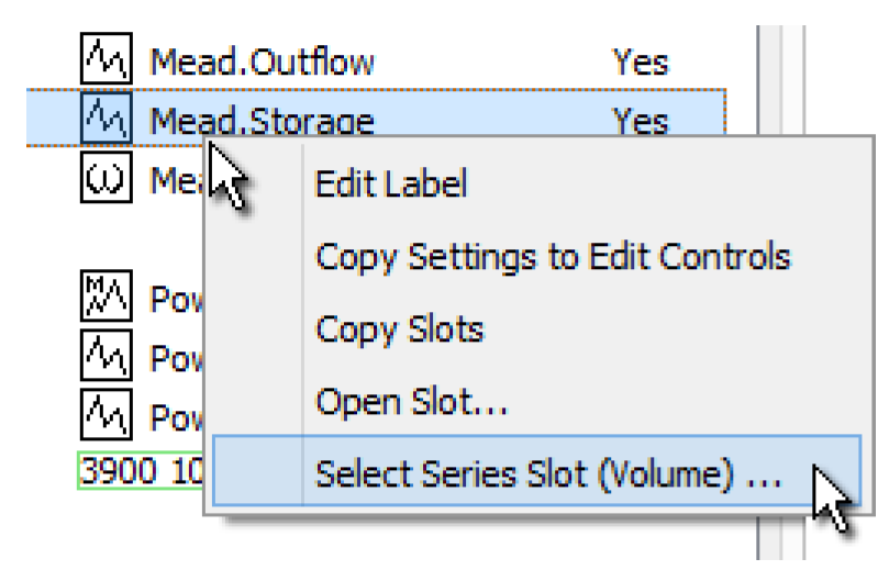 • Select Slot -- shows the general slot selector to replace a curve's slot with a different slot. Only a slot of the same type (e.g. Series Slot) and unit type (e.g. Flow) can be used.