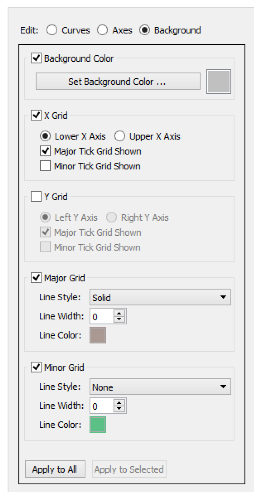 Background edit mode, the plot items (not curve and marker items) within the plot item table are enabled for selection. Changes to plot background color and grid configuration can be applied to the selected plots, or to all plots in the plot page.