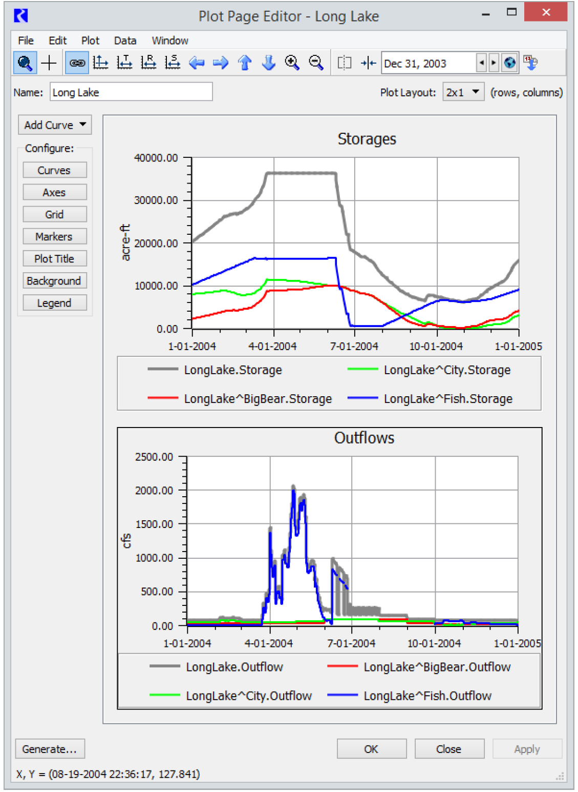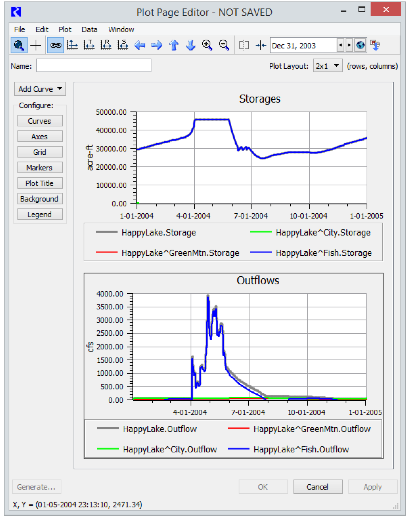 In the generated Plot Page, if the source data does not exist, the Plot Page will be created with a placeholder. For example, in Figure 2.32, the Storages plot has no HappyLake^GreenMtnStorage, so there is a legend item, but no data is plotted. You can pick new slots for such curves or delete them using the menu shown by right-clicking the curve in the legend.
