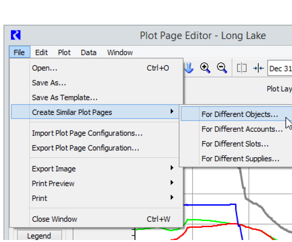 The Create Similar Plot Pages utility allows you to create one or more plots that are similar to the current plot. You can create Plot Pages similar to the existing Plot Page when you only want to replace objects, accounts, slots, or supplies that are the source of data for curves on the Plot Page. This approach is similar to Plot Templates, but Plot Templates allow you to replace multiple entities, like both objects and slots, for example. A Template only creates one Plot Page at a time. However, creating similar plot pages is more direct; you do not have to create an intermediate Template. Also, creating similar Plot Pages applies to multiple items (like four reservoir objects) at one time, allowing you to create multiple new Plot Pages in one action. See Plot Page for details.
