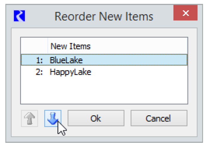 By default, multiple items are listed in alphabetical order. If the new objects do not match properly across the rows for the desired Plot Pages, the items can be reordered for a row by selecting Reorder New Items. This brings up a dialog with a list of the items, which can be reordered by selecting an item and selecting Up and Down arrows to move them as desired.