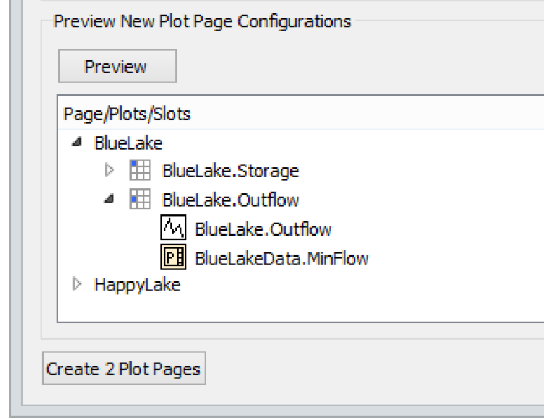 The Preview New Plot Page Configurations section of the dialog allows you to preview in a tree-view the Plot Pages that will be generated based on the information entered into the dialog. This listing includes the save name for each Plot Page, the plot title for each plot on the page, and the slots that will be placed onto each plot. This gives the user the opportunity to review basic information about the Plot Pages that will be created before actually generating them.