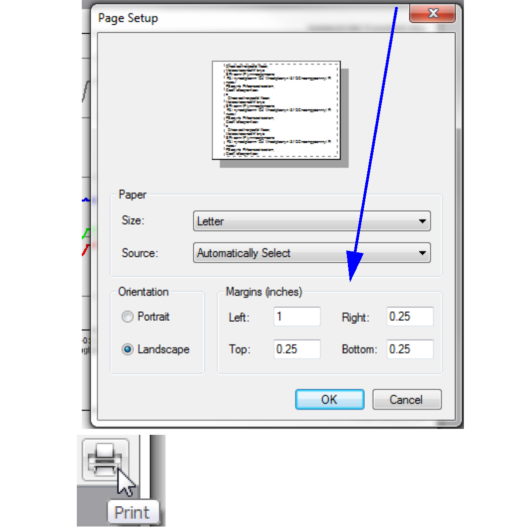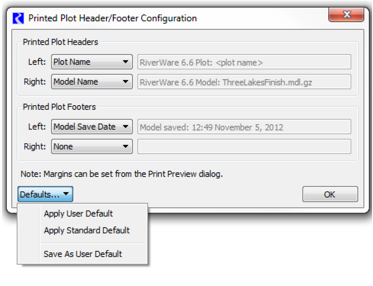This is the only place where print margins can be configured. The margin settings made in the Page Setup dialog will persist—including to subsequent RiverWare sessions—and apply to all printer use within RiverWare.