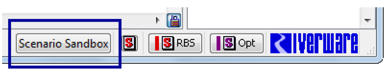 • Use a sandbox (if configured) to define and make scenario runs and compare results (easiest option, but limited controls). A sandbox has been configured if the Scenario Sandbox button appears on the bottom of the main RiverWare workspace. See Scenario Sandbox for details.