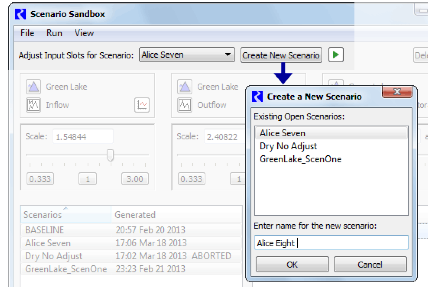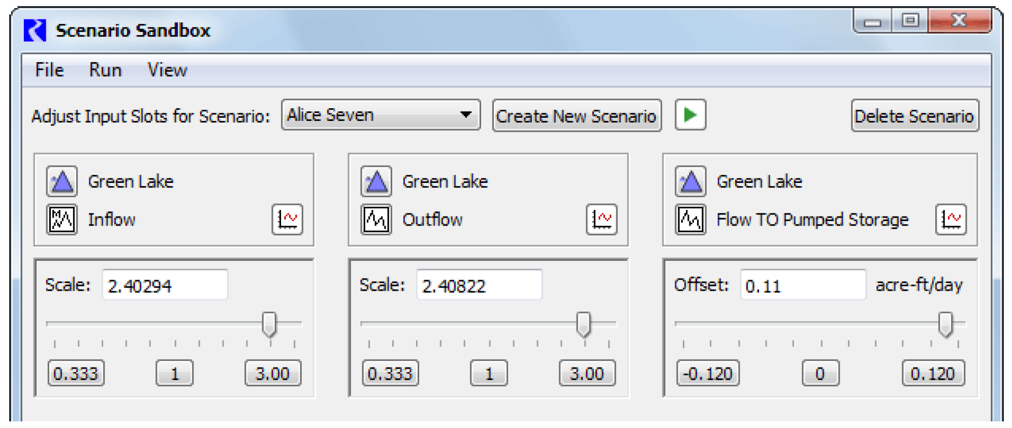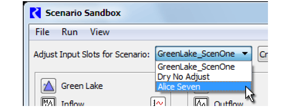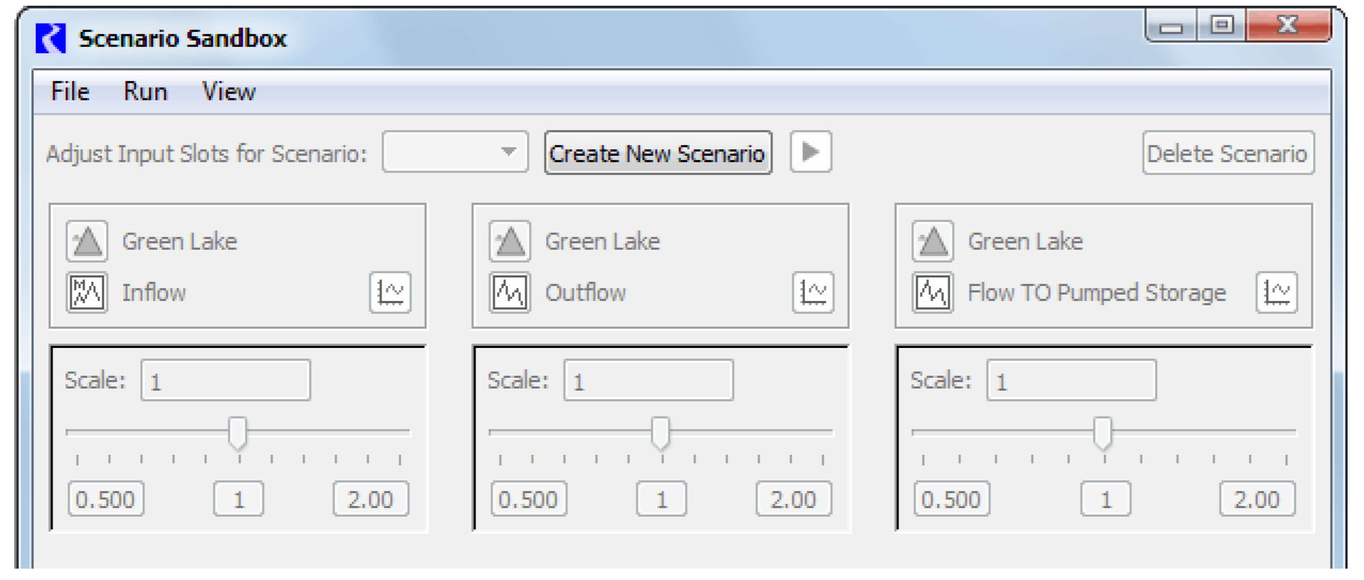 The Scenario Sandbox is accessible from the RiverWare Workspace and from the Scenario Manager. If a Scenario Sandbox has been configured,