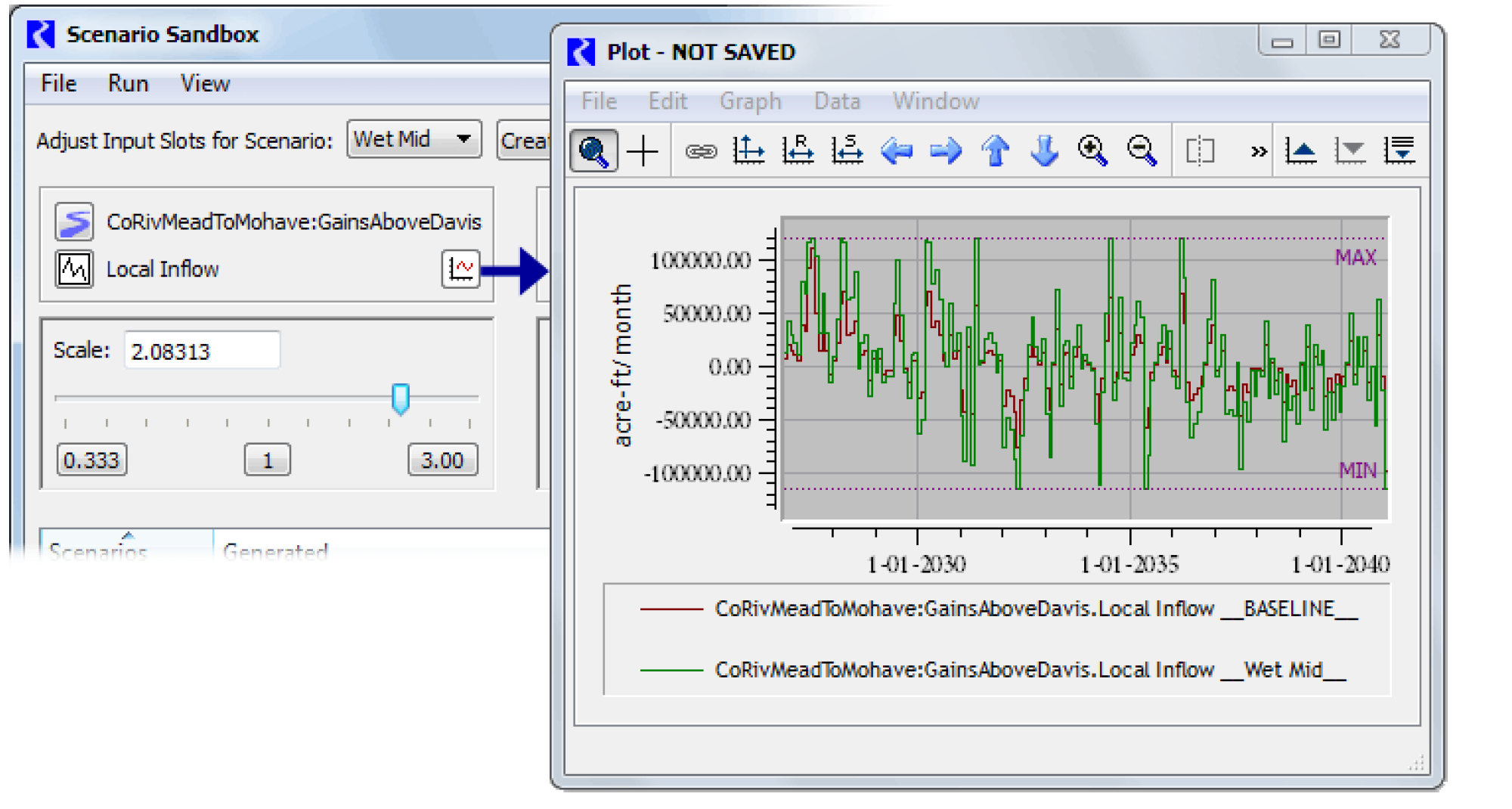 • A plot button to show a plot dialog with both the adjusted scenario slot values and its baseline slot values. If minimum and/or maximum limits are configured for the scenario slot, those limits are shown as horizontal markers in the plot.
