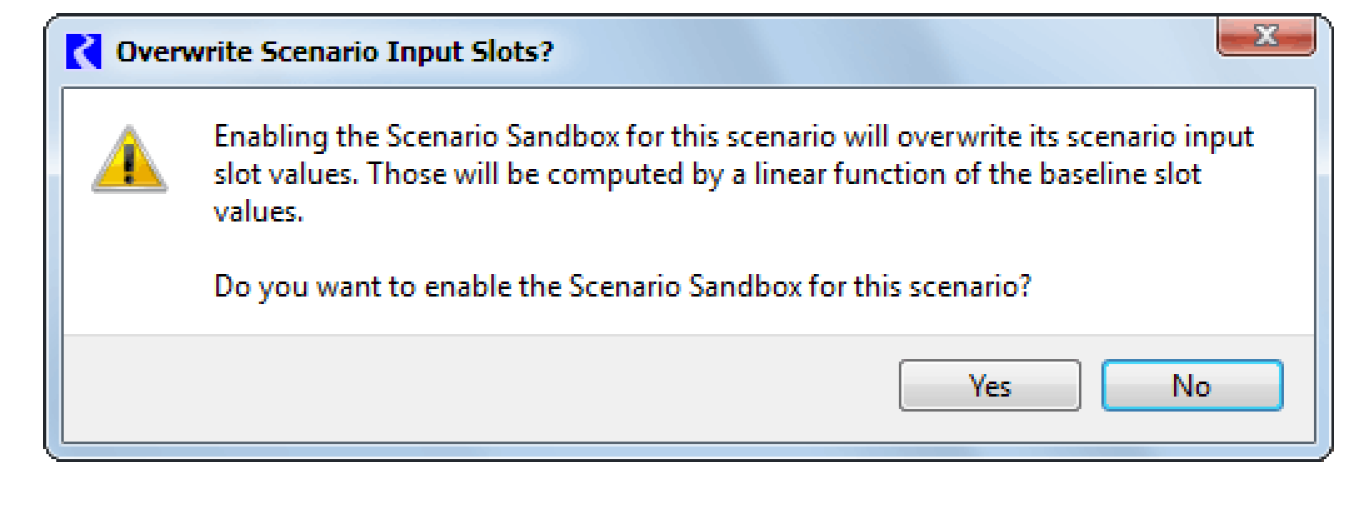 For any particular scenario, full editing of Scenario input slots can be made available by unchecking the checkbox to the left of the Sandbox button on the Scenario Manager. When re-enabling the Sandbox for a scenario, if doing so would effect the values of those input slots, this warning message popup is displayed, providing the option to keep the Sandbox disabled (and preserve the scenario’s input slot values).