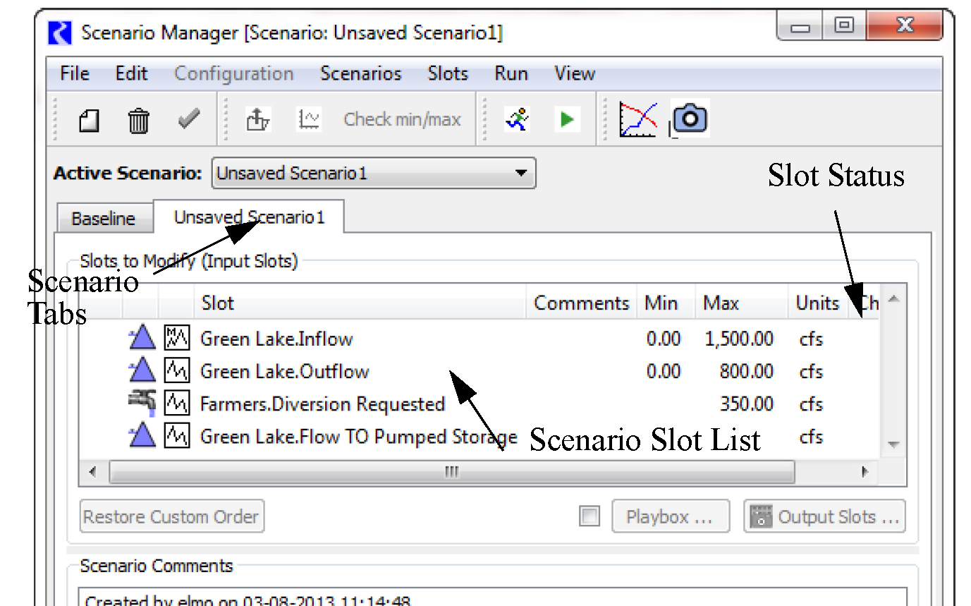 Select File, then Save Scenario As from the Scenario Manager menu bar. This will add an additional line to the Scenario Comments field indicating the new name of the scenario file.