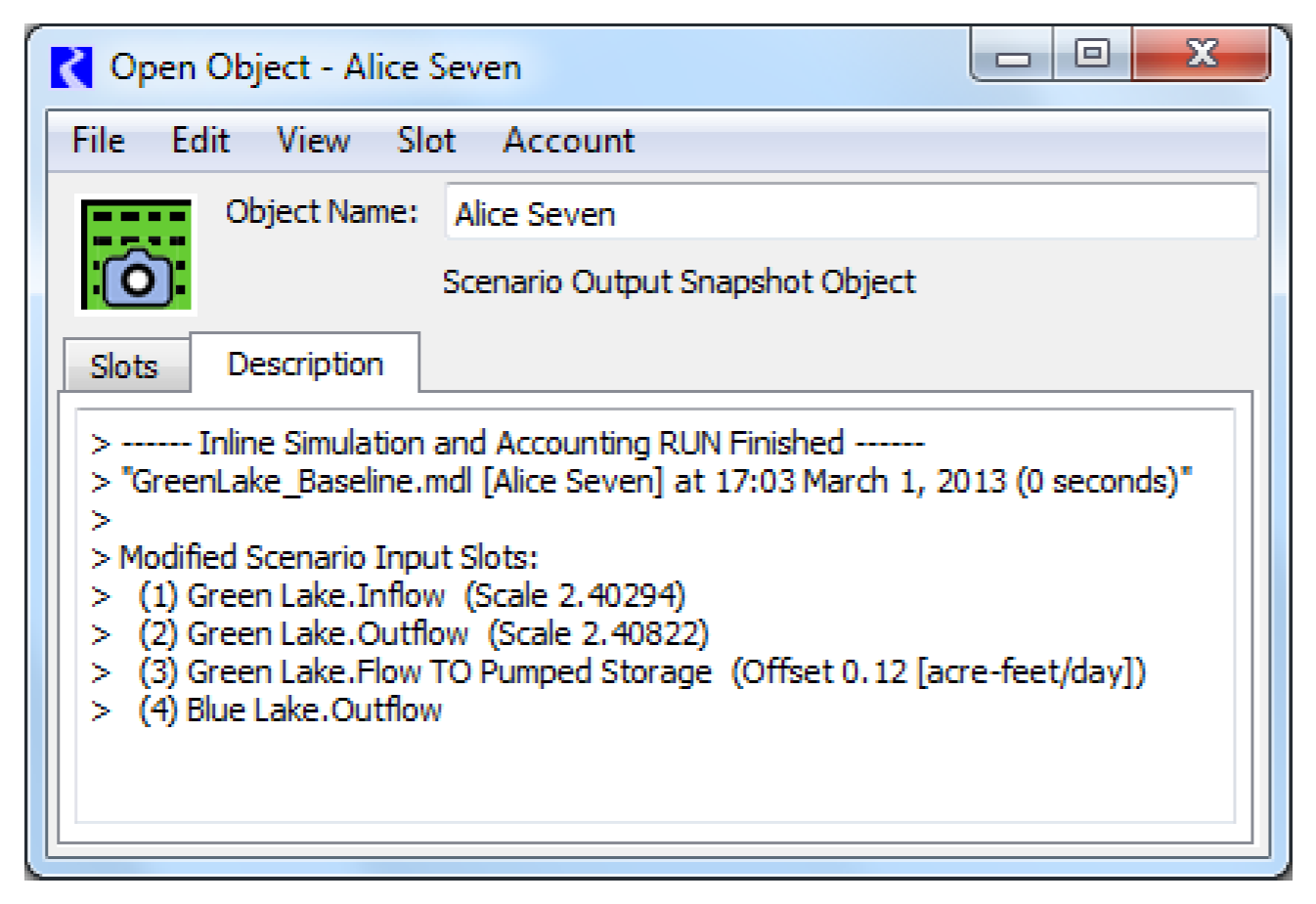 A snapshot object, or Scenario Output Snapshot Object, is automatically created after each scenario run (and also for the baseline run) to capture the values of a prescribed list of slots which generally represent outputs from the run. These new snapshot objects include copies of slots prescribed by the Scenario Engineer.