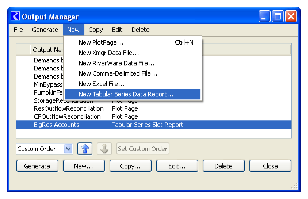2. From the Output Manager dialog menu, select the New, then New Tabular Series Slot Report.