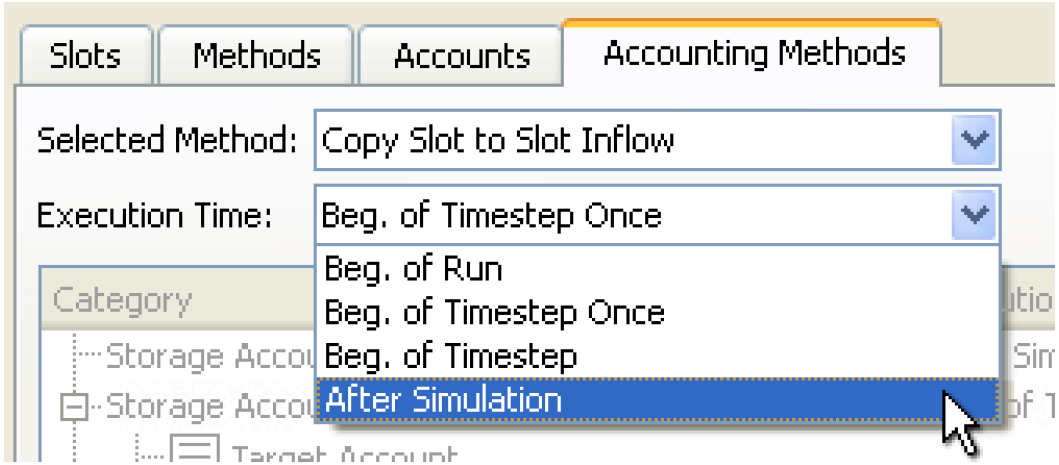 A new compiled OLAM has been added to Reaches, Control Points, and Reservoirs. The Copy Slot to Slot Inflows method copies the object’s local inflow to the target account’s Slot Inflow and sets the other accounts’ Slot Inflow to zero. The target account is specified in a list slot called Target Account. See Copy Slot to Slot Inflows in Accounting for more information.