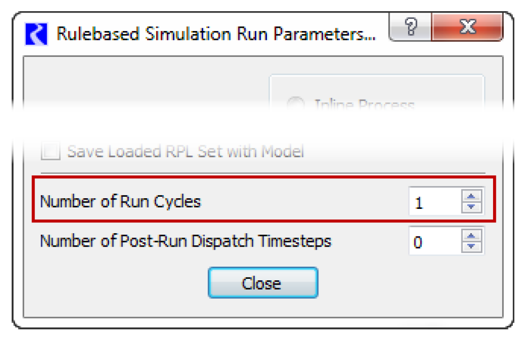 Traditionally and by default, RBS simulations cycle through the timesteps in the run a single time, i.e., the default number of Run Cycles is 1. You may adjust this value upwards in the Rulebased Simulation Run Parameters dialog.