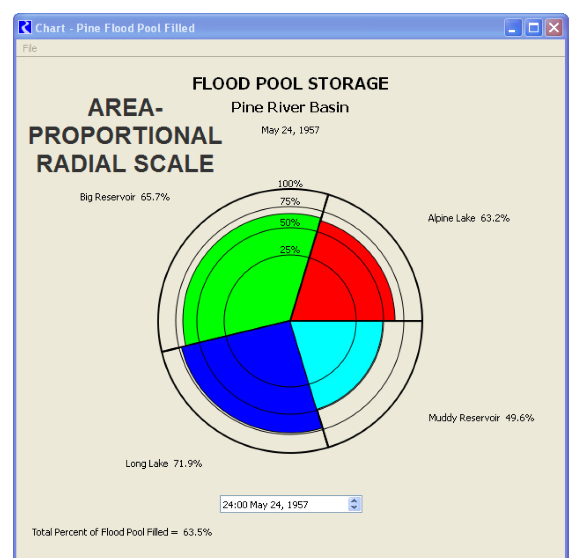• Linear Radial Scale: The chart shows a radial dimension of data in addition to the data creating the pie slices. For example, the pie slices could show each reservoir’s portion of the total flood pool storage that exists in the basin if all flood pools were filled. The radial dimension could show how much of each reservoir’s flood pool is actually filled at a certain timestep. Only the actual storage part of the pie slice is colored. The radial dimension has a linear scale.
