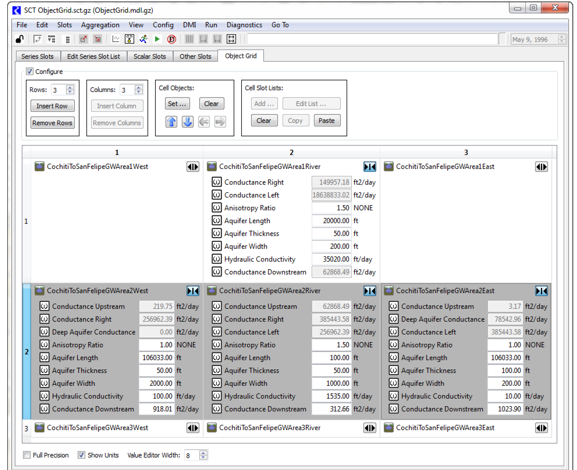 This setup allows you to spatially arrange your objects and then edit the slot data based on that spatial arrangement. An initial use of this tool was for groundwater objects that interact with each other. The network of object was created in the Object Grid and then was used to configure each object’s data as necessary. The following screenshot shows the SCT Object Grid for several groundwater objects: