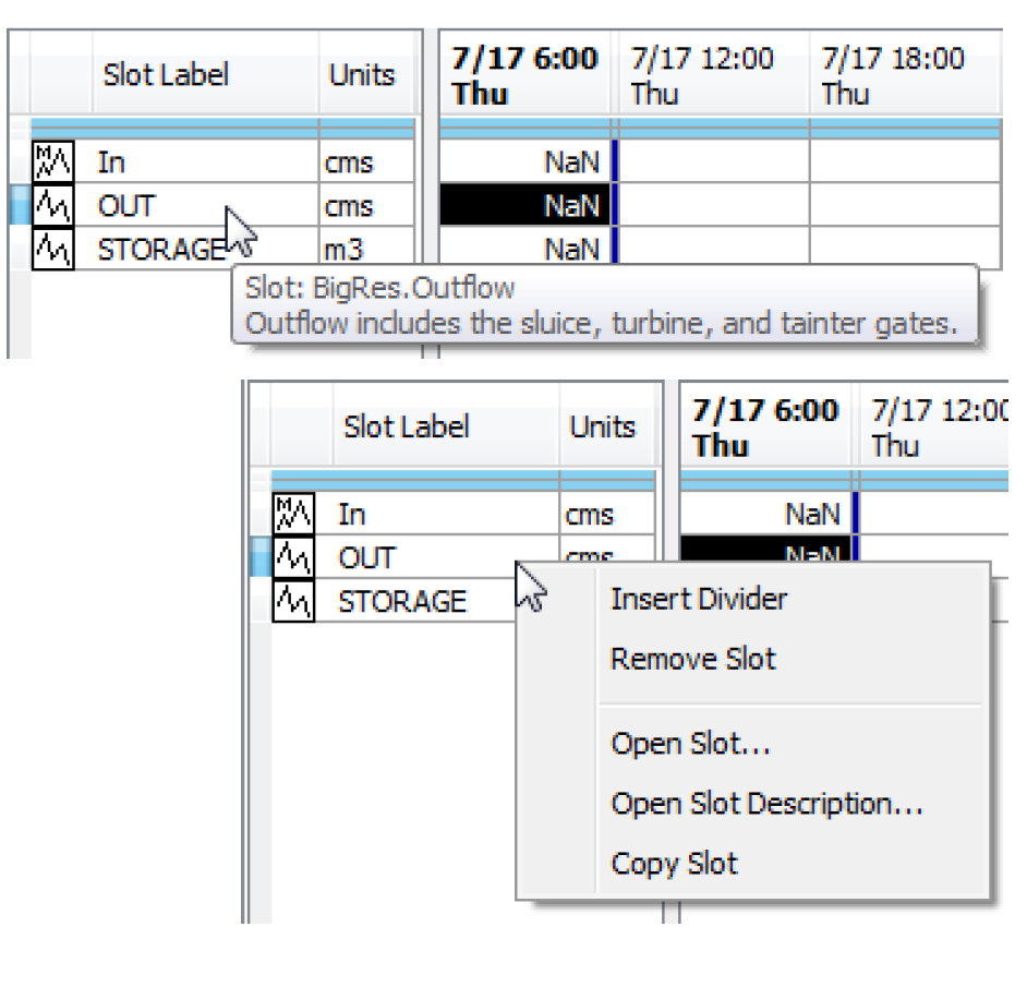 • Open Slot Description... context menu: Right-click and choose to Open Slot Description. This shows the slot's Open Slot dialog with the Description panel open. This is where slot descriptions are provided by the user.
