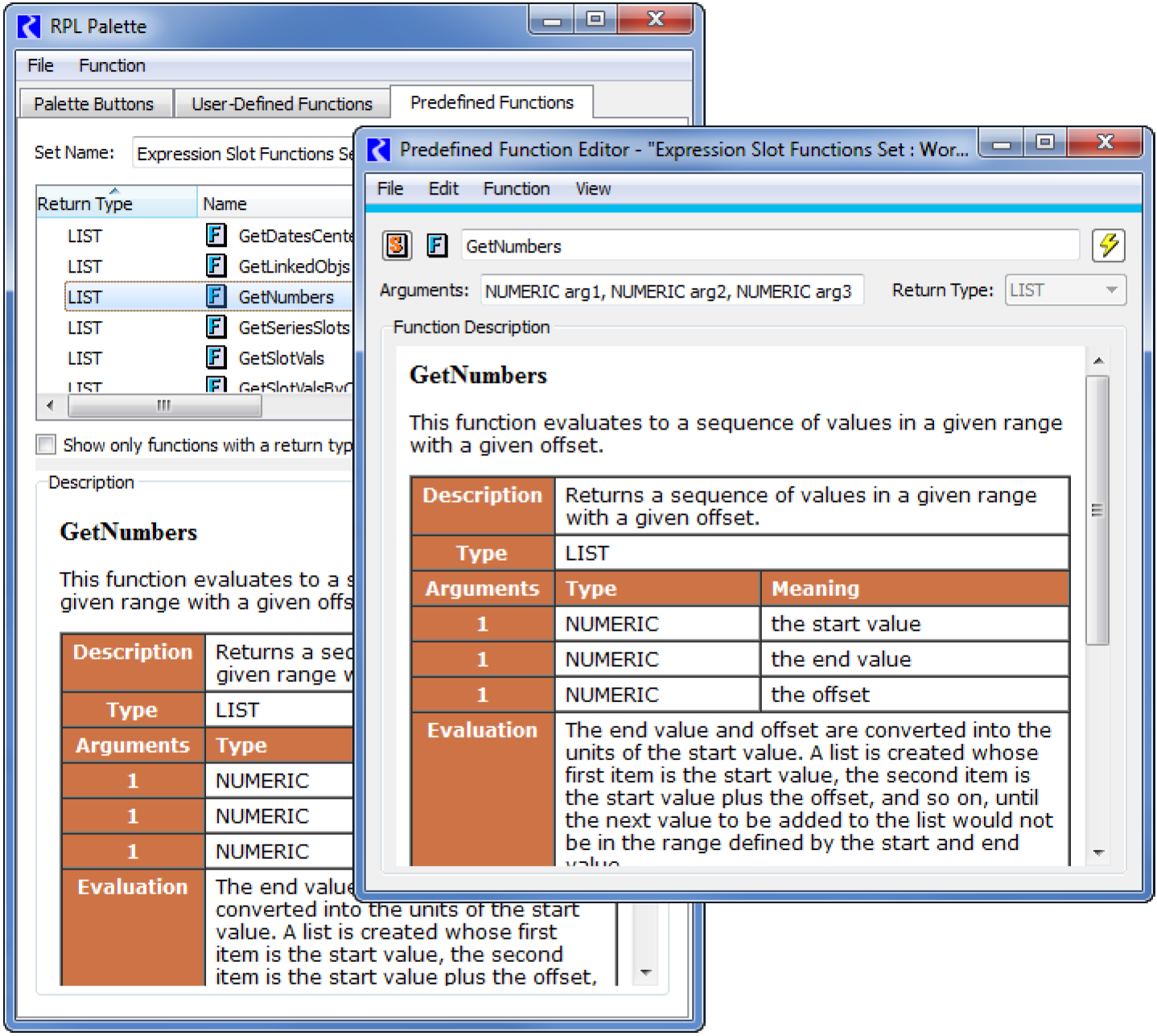 The RPL predefined function help content is now shown within the RiverWare interface in the following dialogs: