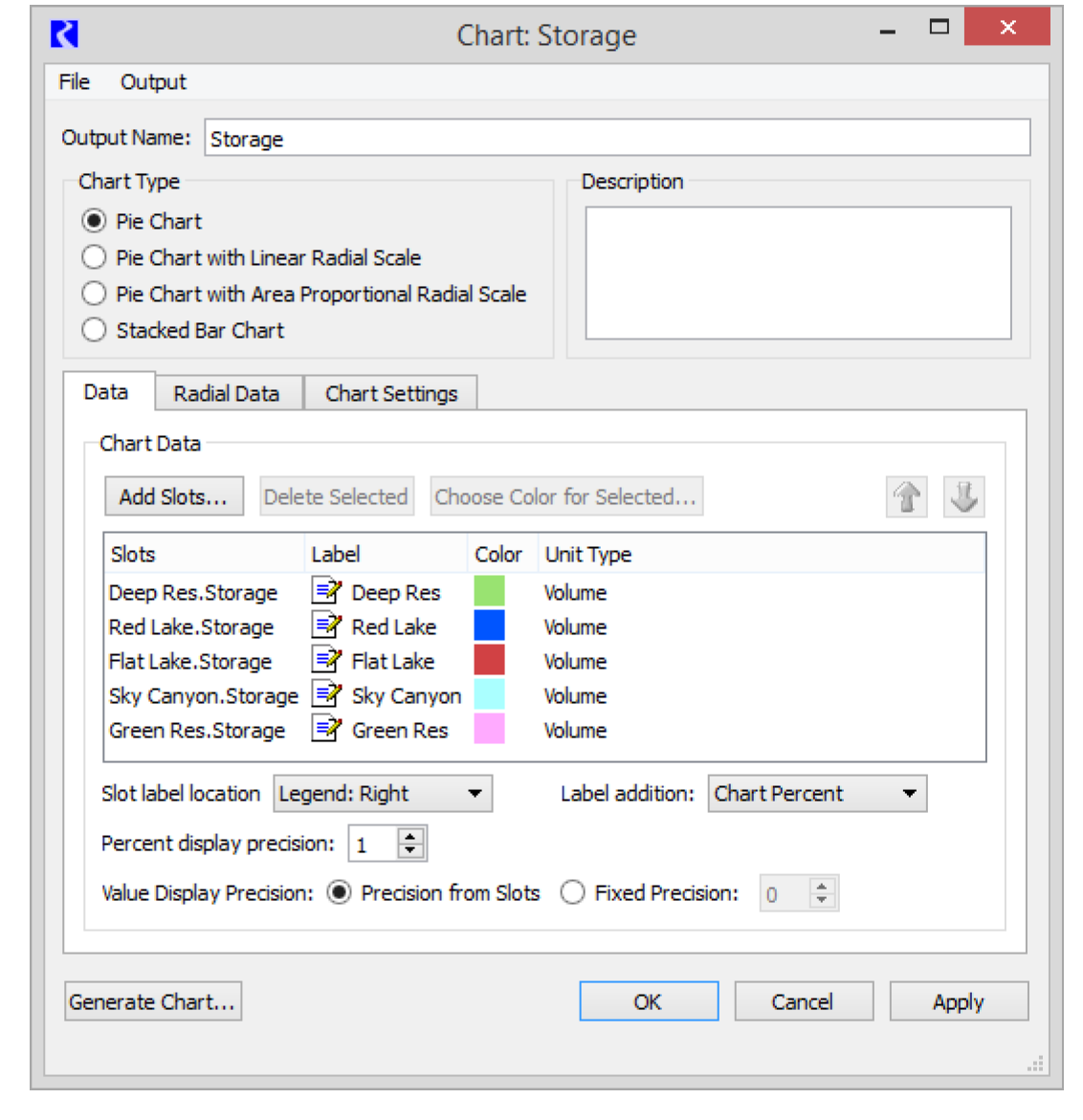 The Chart configuration dialog was reorganized into three tabs to reduce the overall size of the dialog. The tabs are Data, Radial Data, and Chart Settings.
