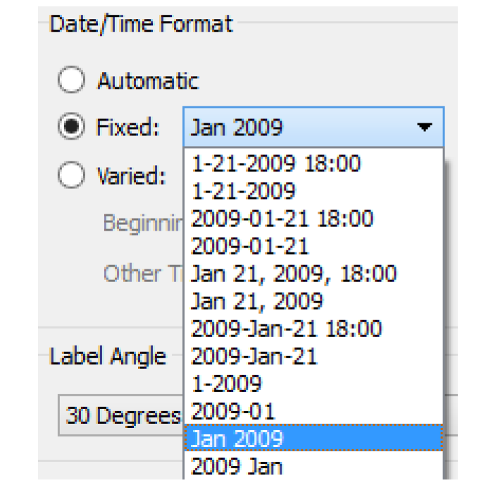 For axes that have Date/Time units, you can now configure the format of the Date/Time. This is supported with three distinct format selection algorithms: Automatic, Fixed and Varied. For example, the screenshots to the right and above right shows a Fixed Month Year configuration.
