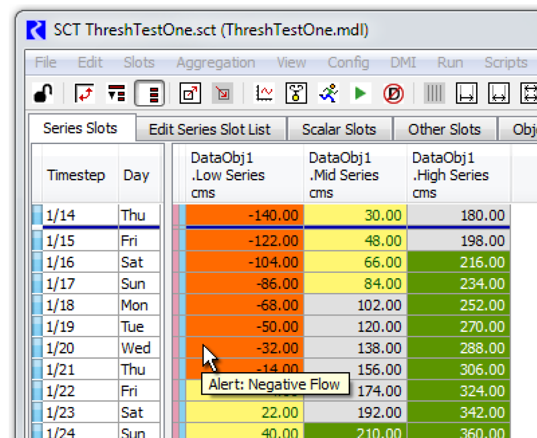 The System Control Table (SCT) was enhanced to support coloring of individual cells based on the numeric value compared to user defined intervals. The set of value intervals and the associated cell colors can be specified individually for each series slot in the SCT. Each interval can be associated with a custom color specification (a foreground/background color pair) or the default color indicating flag value. Following is a sample screenshot showing four different color definitions.