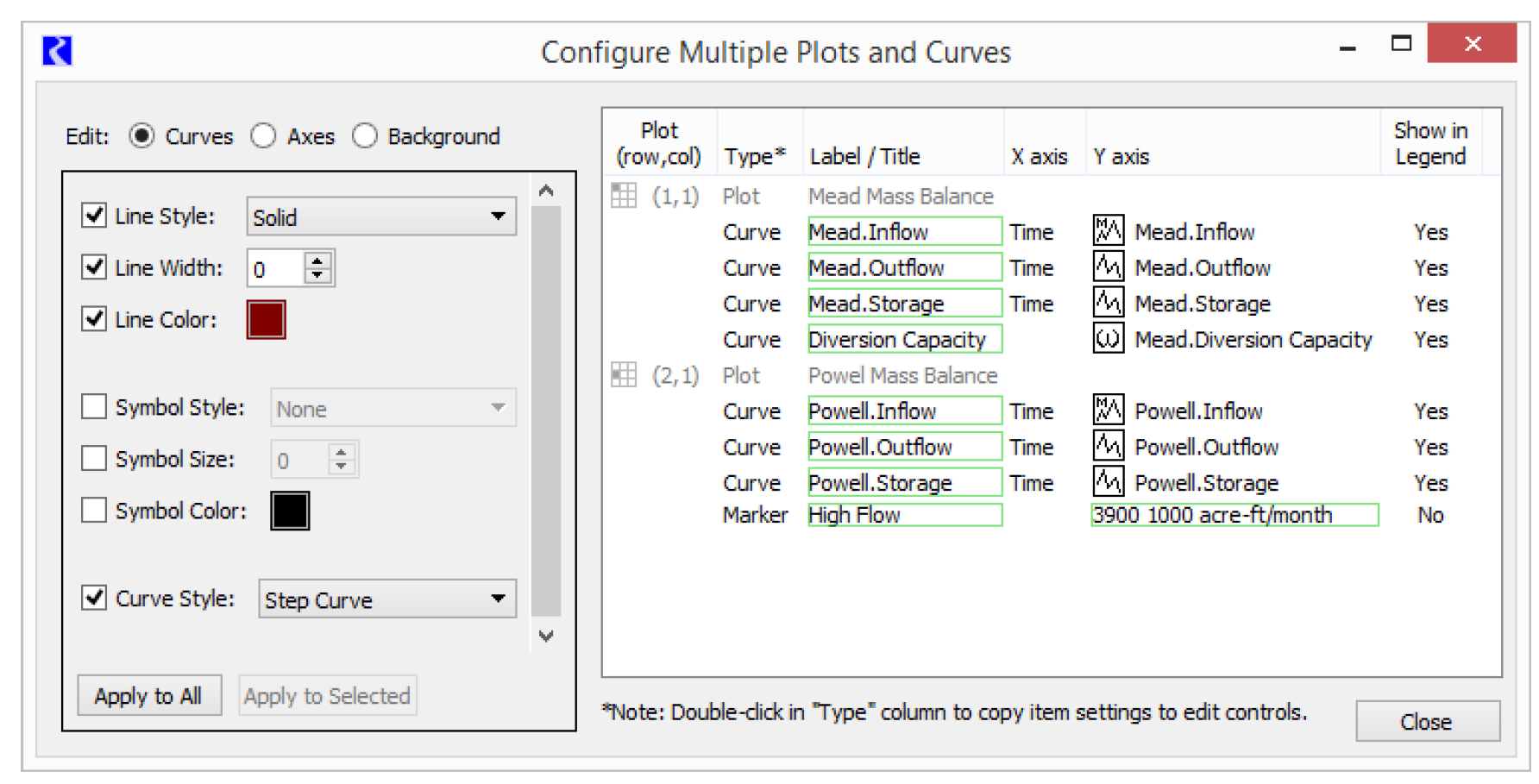 Configure Multiple Plots and Curves dialog. You can select multiple items within a plot page, e.g. curves and markers, and apply selected settings to those items in a single operation. For more information, see