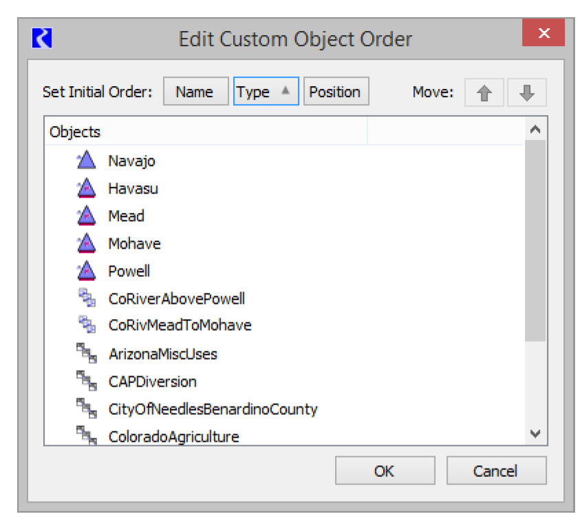 A new dialog was created to provide a mechanism for reordering simulation objects using click and drag, sort-by buttons, and up and down arrows. This is accessed from the workspace Simulation Object List using the Sort Edit Custom Order option.