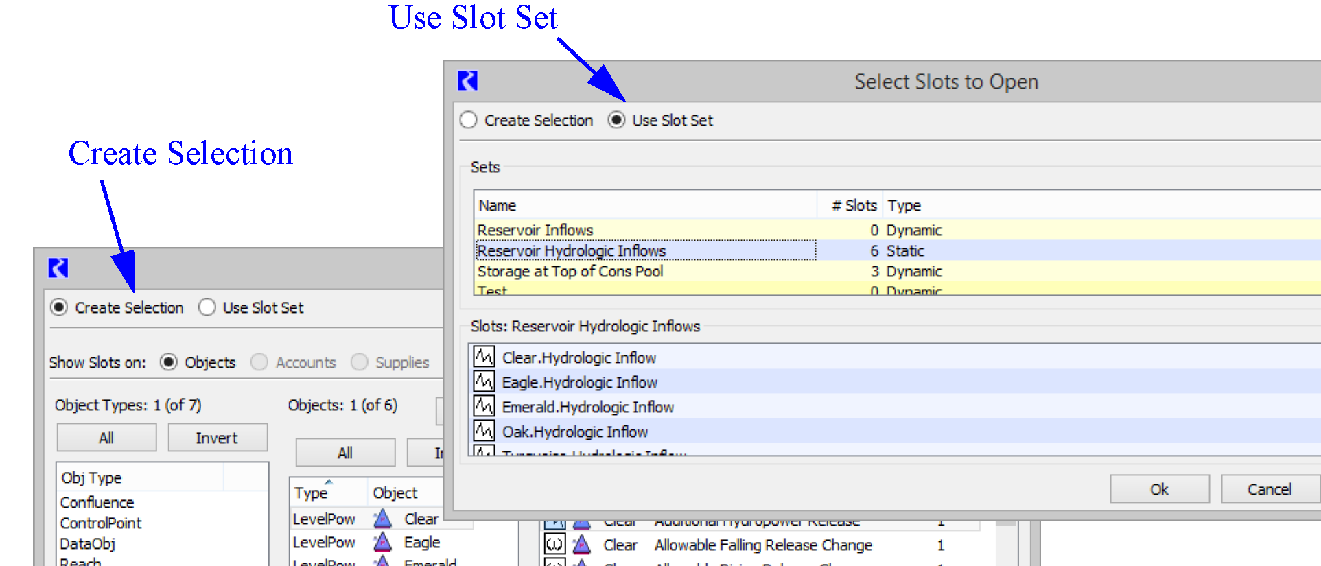 The selector has been modified to allow you to use a defined Slot Set. The new Slot Set functionality is described in Slot Sets. The selector now has options at the top to either Create Selection or Use Slot Set