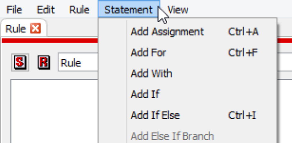 Within RPL block dialogs (Rules, Goals, Methods), the operations to add statements were moved to a separate Statement menu.