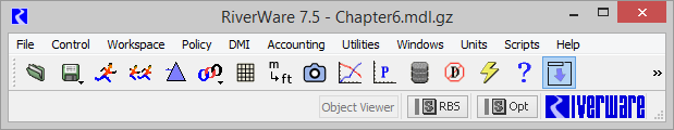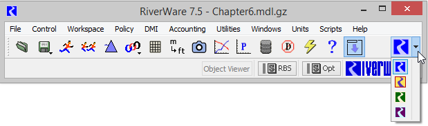 • Select the new RiverWare logo menu button in the Workspace toolbar, as shown in