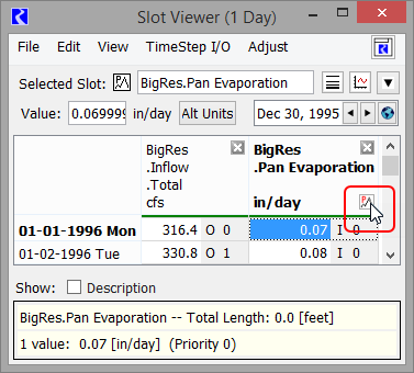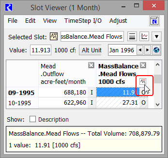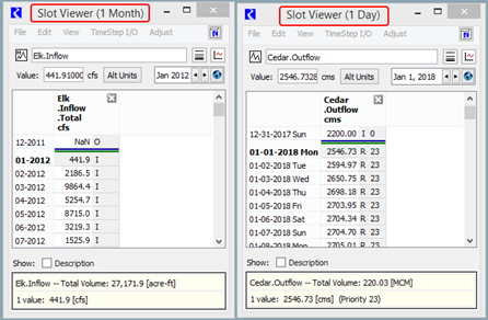Previously, you could open only one Slot Viewer at a time, and it only displayed series data with the same timestep size as that of the model. Now, you can have one Slot Viewer for each timestep size in RiverWare. Each Slot Viewer is associated with a specific timestep size, which is identified in the window title bar—for example, “Slot Viewer (1 Month)” and “Slot Viewer (1 Day)”. The Slot Viewer displays series data with that timestep size only.