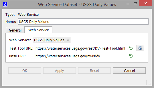A sample web service using the USGS Daily Values option is shown in the following screenshot. In addition to this dialog box, the web service dataset uses name maps to map the name of the slot in RiverWare to the identifier and/or query information for the data on the web service. For example, for USGS data, the name map must include the USGS gage number and the parameter code.