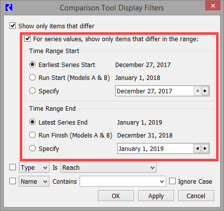 The Model Comparison Tool was enhanced to hide series slot data that differ outside a specified time range. Within the Display Filters dialog box, you can select the “For series values, show only items that differ in the range” check box and specify the time range.