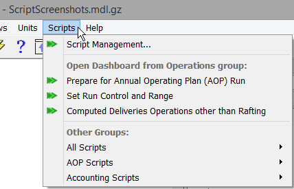 The following shows the new Scripts menu with the default “Operations” group shown. Three other groups show cascading menus.