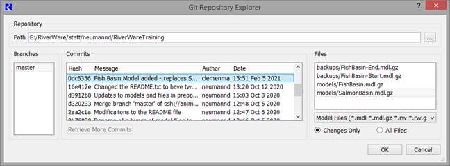 In the comparison tools, you can now select models or rulesets that are part of a Git repository. Previous versions of models and RPL Sets can be selected for comparison using the new Git Repository Explorer dialog shown in