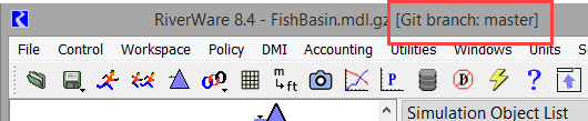 If the currently loaded model file is part of a Git repository, the following is displayed in RiverWare: