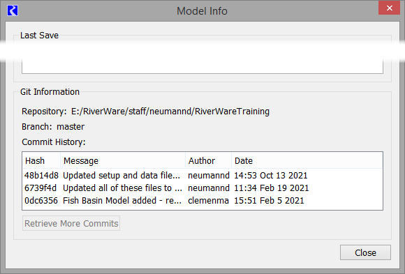 • The current repository, current branch, and commit history for the loaded model file is displayed in the Model Info dialog. See