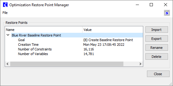 Import Optimization Restore Point script action or via the Optimization Restore Point Manager. This allows the Restore Point to be used in a separate RiverWare session with the same model or in distributed MRM (see