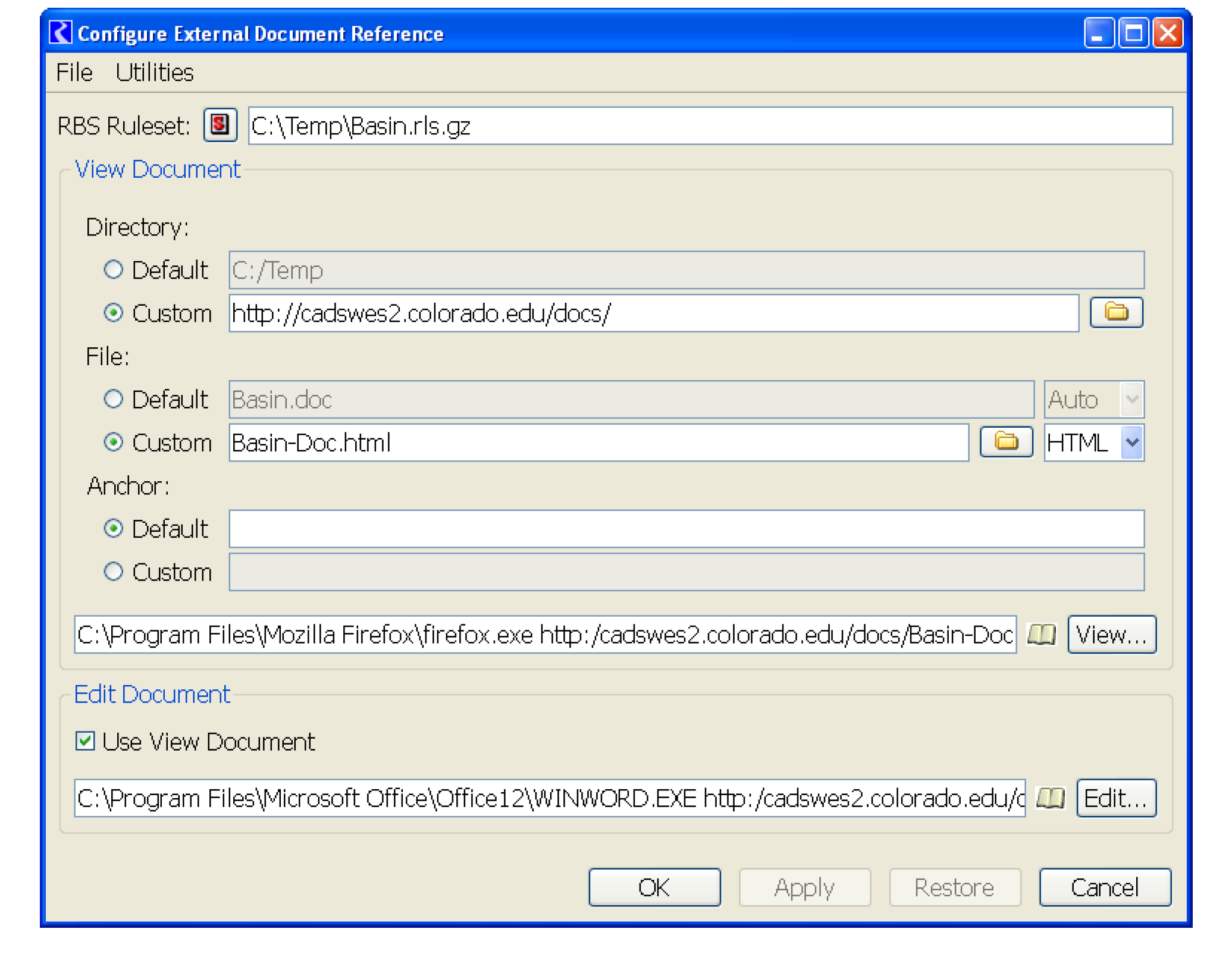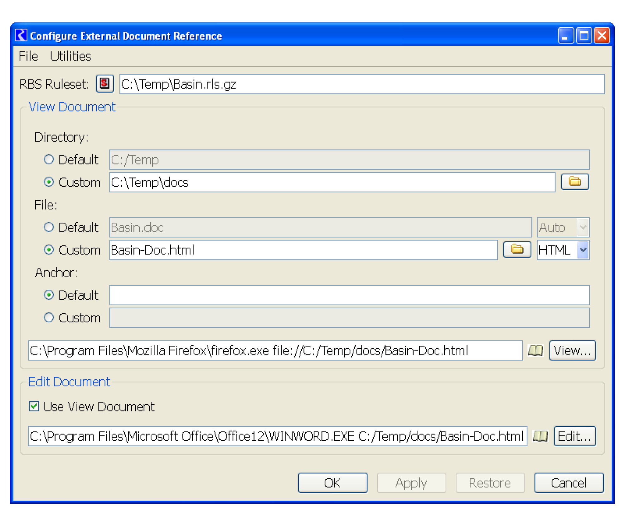 2. We do not like the name of this file (and to avoid overwriting our completed external document with an inadvertently generated template file in the future), we change both the file name and the name in the configuration. We change the file to Basin-Doc.html using windows explorer. In the File area of the configuration, we change the name to Basin-Doc.html and select Apply when complete.