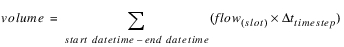 Evaluation | The number of seconds in the timestep of the datetime argument is determined. Then, the volume argument is divided by this number of seconds. | |