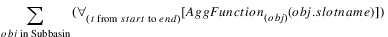 Description | Sum of a timeseries of values, each of which is the result of aggregating several objects’ slot values. | |