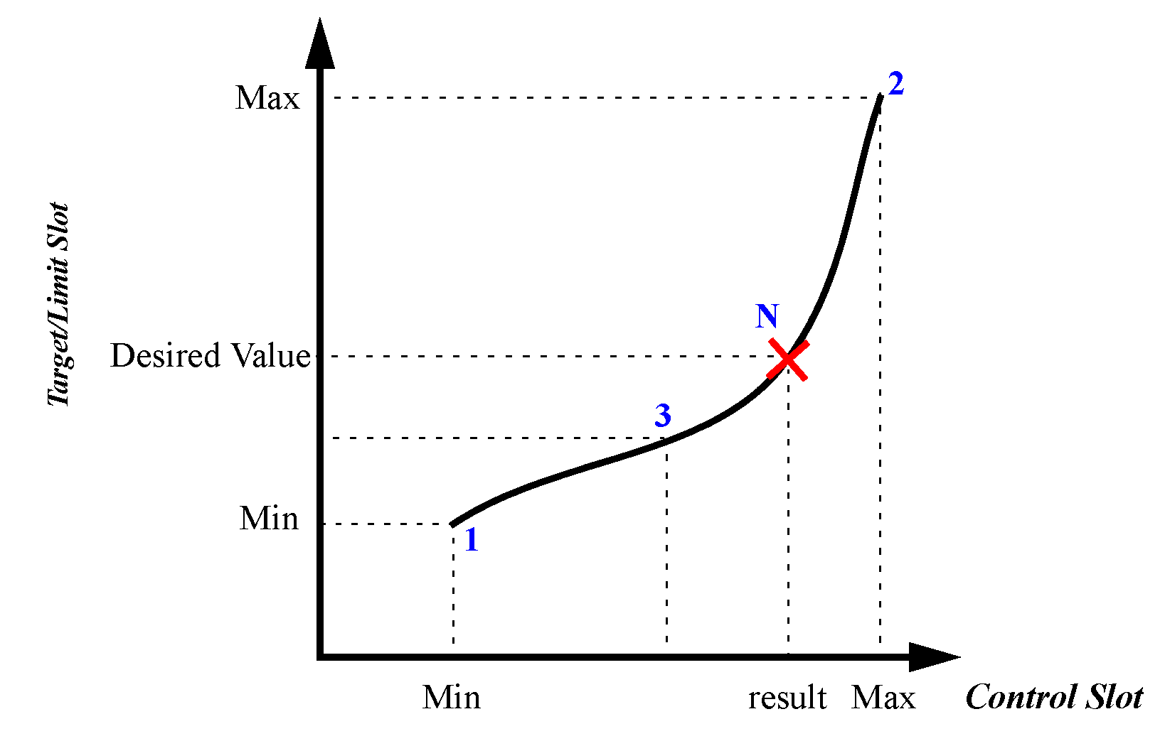 HypLimitSim, HypLimitSimWithStatus, HypTargetSim, and HypTargetSimWithStatus perform an iterative solution. For each of these functions, you provide min and max values for a control slot and a target or limit of a downstream slot. The computations then boil down to univariate zero-finding, where each evaluation is a hypothetical simulation with different inputs. The solution is found using the bisection method as shown in the following figure; it simulates using the min control slot value (1), then the max control slot value (2), then bisects between the two(3). It continues bisecting until the tolerance or desired accuracy of the limit/target slot is met and a solution is found (N.) If the result of any try is outside of the range of previous tries, then a warning message is issued saying that the function is non-monotonic. There are either multiple solutions or the function is not well behaved. This typically leads to convergence issues.