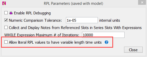 E != E | BOOLEAN | <expr> != <expr> Inequality comparison. The result is TRUE if the first expression is not equal to the second expression. Otherwise it is FALSE. The two arguments can be numeric expressions of the same unit type, fully or partially specified datetime expressions, object expressions, slot expressions, boolean expressions, string expressions, and list expressions. Numeric expressions are automatically converted to common units before comparison. Datetime expressions are considered greater as they are later in time. A fully specified datetime expression can be compared to a partially specified datetime expression; in this case, only the largest time unit is compared. See below for more information on tolerance during the comparison. |