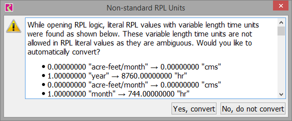 WARNING(E, E) NOTICE(E, E) ALERT(E, E) | datatype of the second expression | WARNING(<expr>,<expr>) NOTICE(<expr>,<expr>) ALERT(<expr>,<expr>) When one of these expressions is executed, a message is posted to diagnostics for that particular expression (warning, notice, or alert). See Notice, Warning, and Alert Expressions in Debugging and Analysis for more information on these messages. The first argument of the operator is the content of the diagnostic message and the second argument is returned as the value of the expression. For example, when the following expression is evaluated, if the estimated flow is negative, a warning is posted to diagnostics and the expression evaluates to the estimated flow, a NUMERIC: WITH NUMERIC estimatedFlow = EstimateFlow() DO IF (estimatedFlow < 0.0 cms) THEN WARNING(“Estimated flow is negative”, estimatedFlow) ELSE estimatedFlow ENDIF END WITH |
