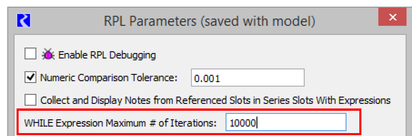 WHILE | any | WHILE ( <boolean expr> ) WITH NUMERIC result = <numeric expr> DO result = <numeric expr> END WHILE Structure for looping as long as a condition is TRUE. The conditional boolean expression is evaluated prior to each loop. If the boolean expression is TRUE, the numeric expression on the second line is evaluated. If the boolean expression is FALSE, the structure stops looping and returns the value of the value variable. The value variable, result, is initialized on the first line of the structure. Each time through the loop, the expression on the second line is evaluated and its value is set on the result variable. The previous value of the result variable may be used inside the expression on the second line. The result may be of any expression type even though the default structure uses the numeric type. To change the type of the value variable, result, double-click the NUMERIC element and enter the new expression type. The name of the value variable may also be changed. When a WHILE expression is executed, it counts the number of times the body is evaluated, and fails with a message if the iteration count ever exceeds the value of the RPL parameter. The default max iterations is 10,000, but may be modified as needed in the RPL Parameters dialog. (From the main workspace, select Policy, then RPL Parameters to open the parameters). ![]() |