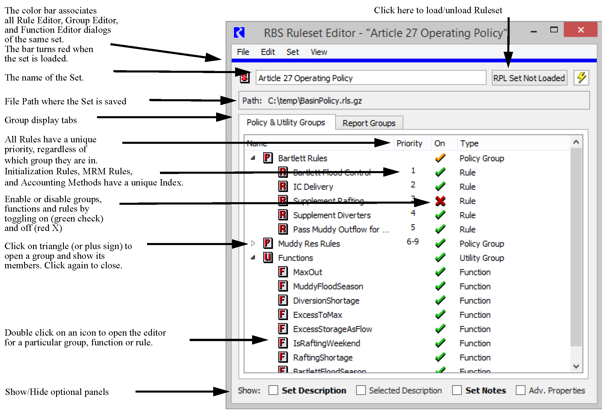 Information about a RPL set is displayed in the RPL Set Editor dialog. Each policy group, utility group, block, and function is represented in the RPL Set Editor on a different line. Figure 2.5 illustrates.