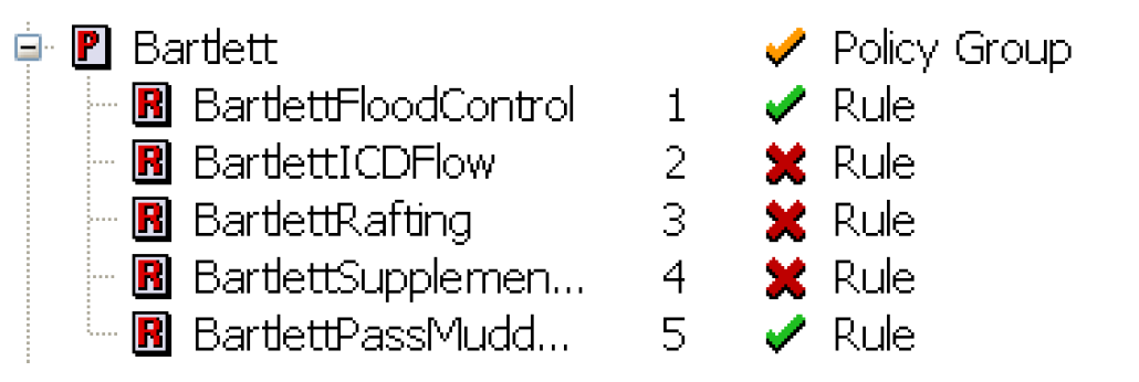 • Priority: A priority is shown to the right of an element name, when appropriate. Policy groups, utility groups, and functions do not have priorities but policy groups display the range of priorities of its member rules. Priorities number indicates the relative importance of the block.