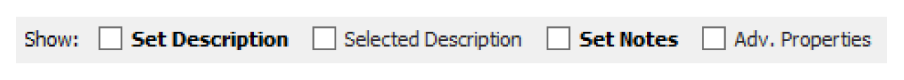 Note:  The following four items can be shown using the View menu or selecting the toggle in the Show: row. If there is an entry in these panels (or a non-default value) the text is bold. For example, in the following screenshot, the Set Description and Set Notes have a non-default entry.