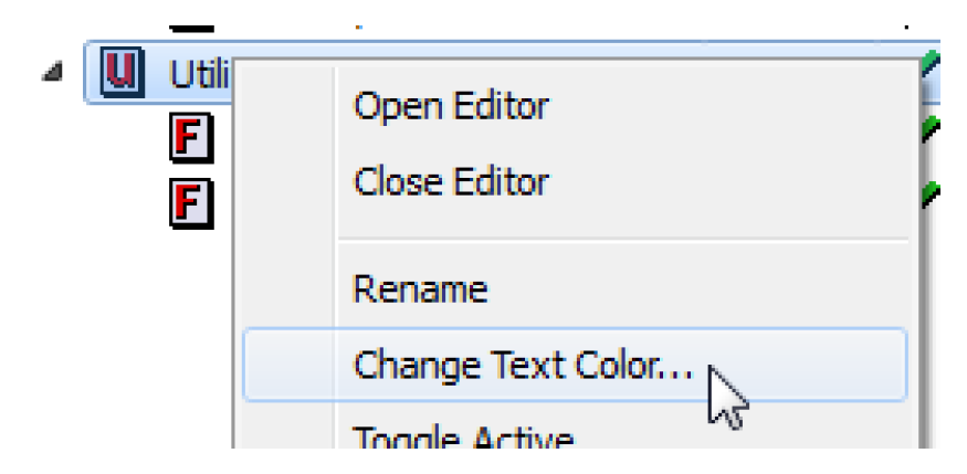 The color of each name in the set can be specified by right-clicking an item and choosing Change Text Color. The selected color is then used by the RPL set editor, the RPL set analysis tool, and the RPL object selector dialogs for the name of the selected object. For groups, the color is changed for the group name and all members of the group that have the default black color.