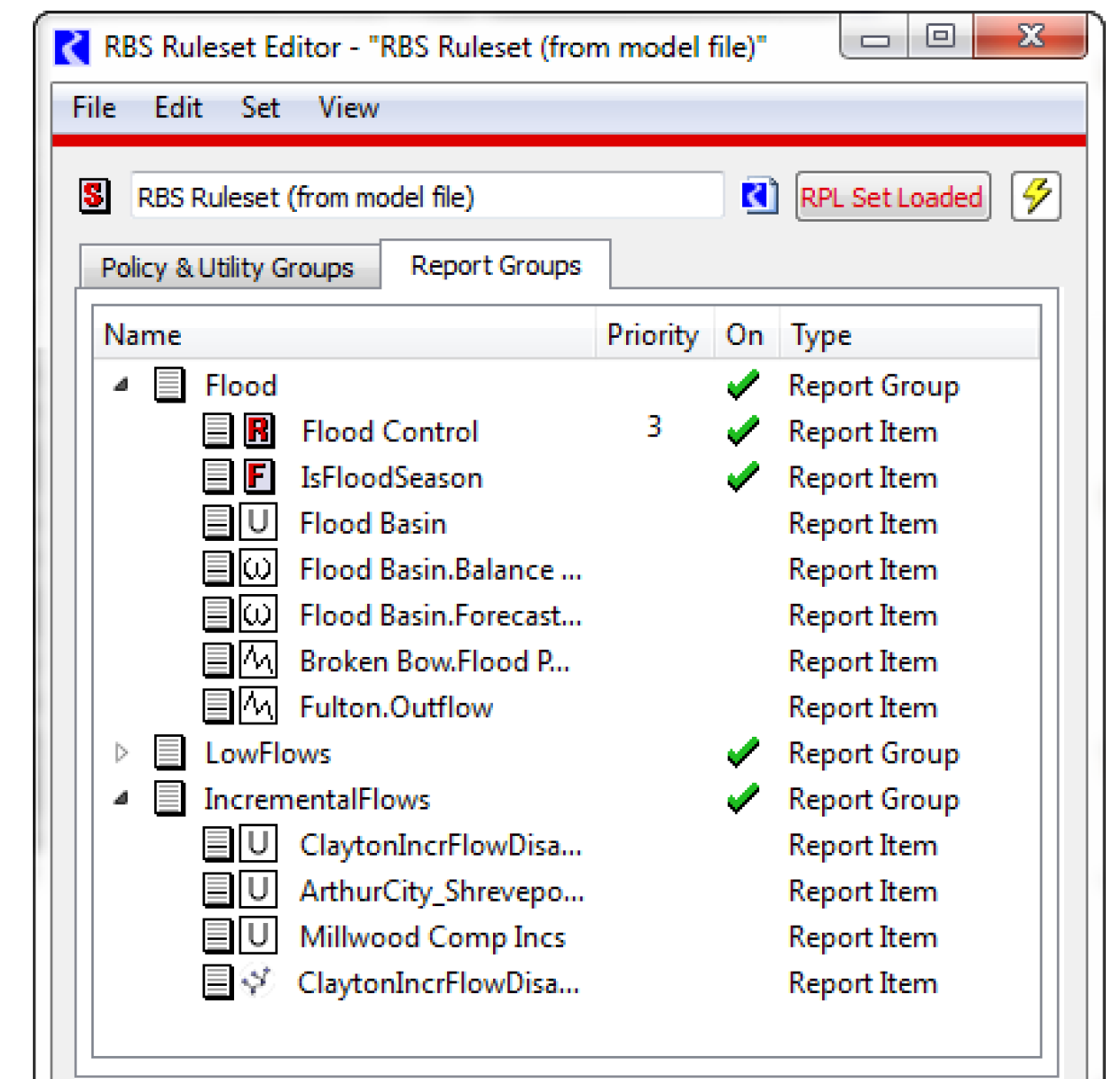 When a RPL set dialog opens, the Policy & Utility Groups tab is initially selected, presenting a comprehensive high-level view of the policy. Switching to the Report Groups tab provides a more selective, user-defined view.