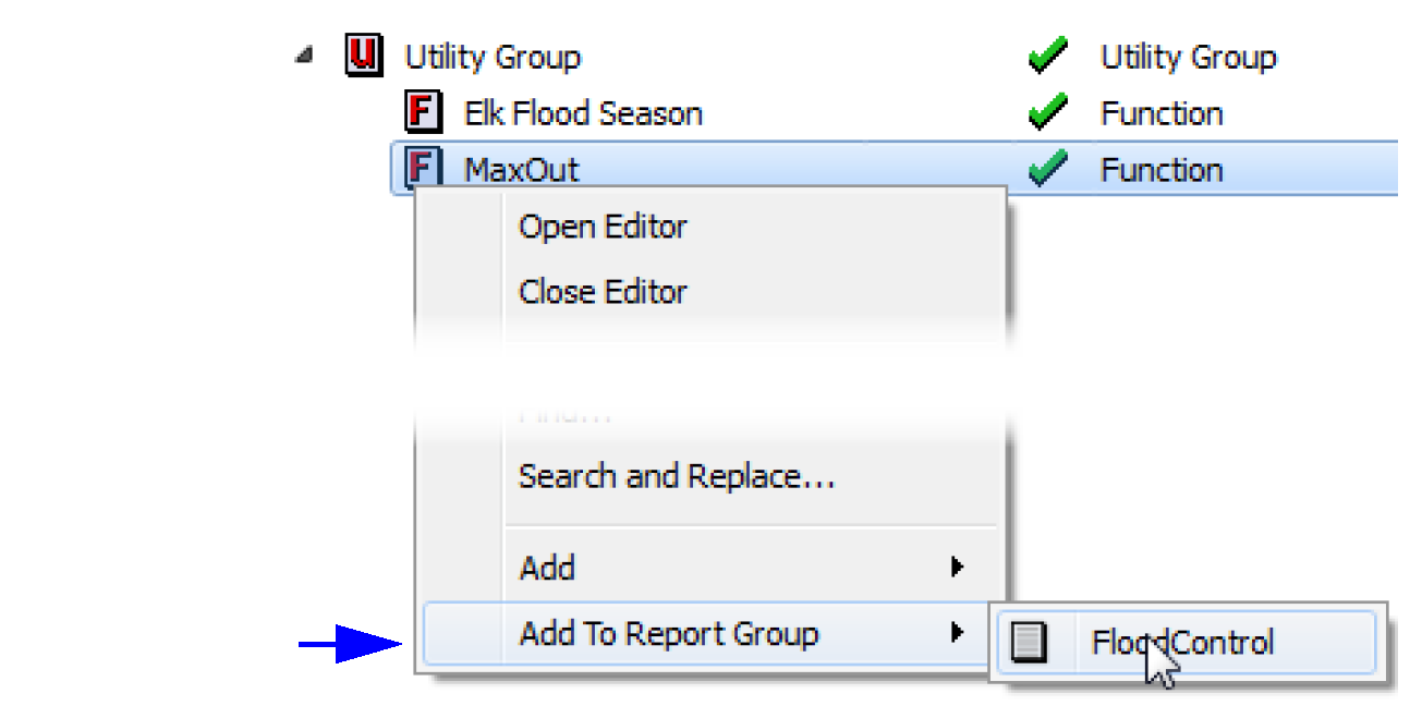 You can also right-click any RPL item (rule, function, etc), and choose Add to Report Group and select an existing Report Group. This will append the selected RPL item to the Report Group, as shown in